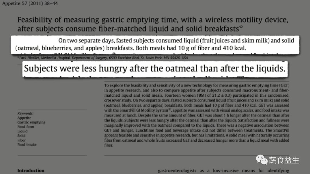 就像这个研究比较液体和固体早餐;或者用果汁和脱脂奶做早餐,或者用加了蓝莓和苹果的燕麦。
