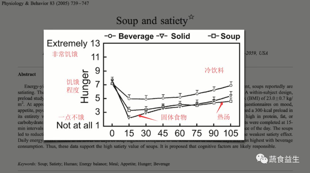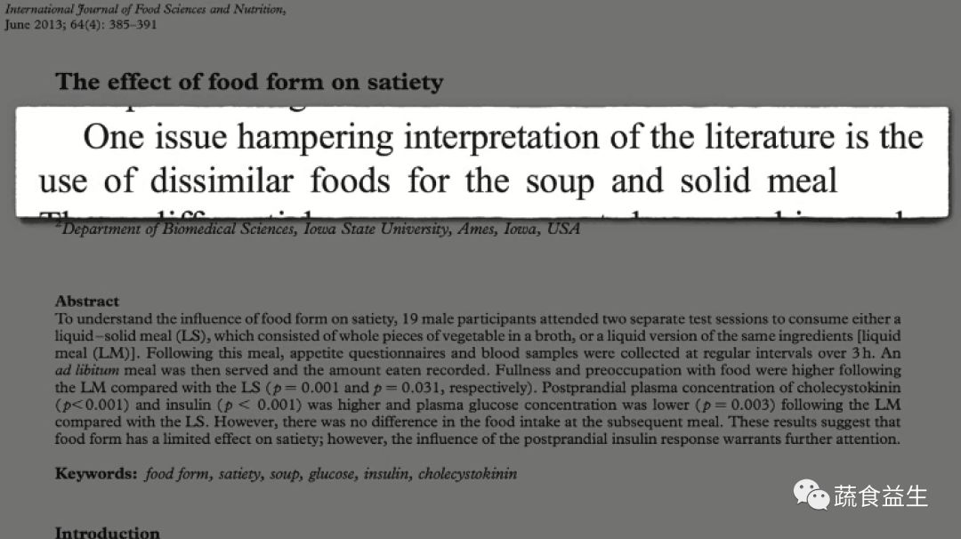 但如果吃的速度减慢而使“吃”汤的饱腹效果象吃固体食物一样的话,那么数据应该与吃固体食物的一组接近。