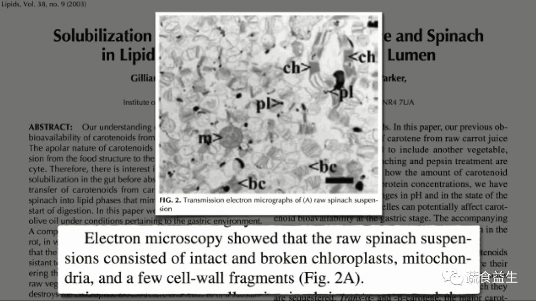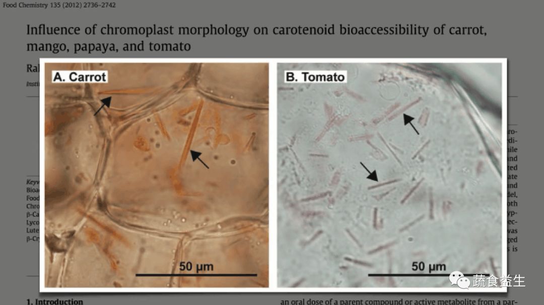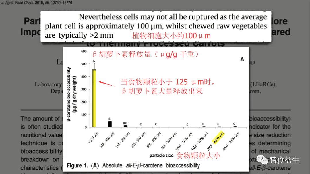 类胡萝卜素等植化素,比如胡萝卜素、蕃茄红素等是藏在细胞壁内的微小晶体,只有在细胞壁破裂后才可释放出来;这就是为什么我们要细细咀嚼的原因。(“Mastication”是医生用词,也是咀嚼的意思。)
