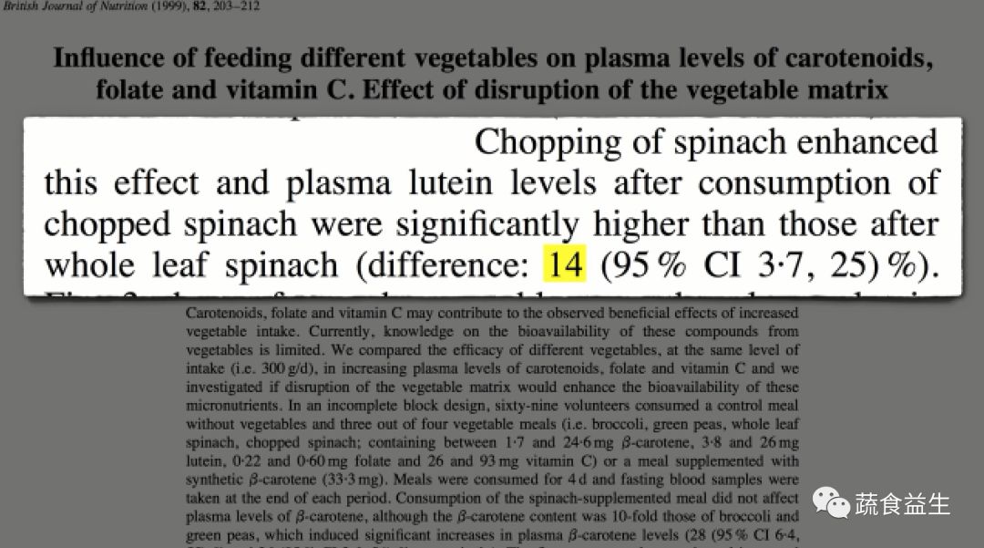 但如果只是吃之前先用刀细细地切碎,血液中的叶酸也比不切碎的情况高2倍 – 对叶黄素的吸收来说也是一样的影响,叶黄素是绿色植化素中对视力特别重要的。