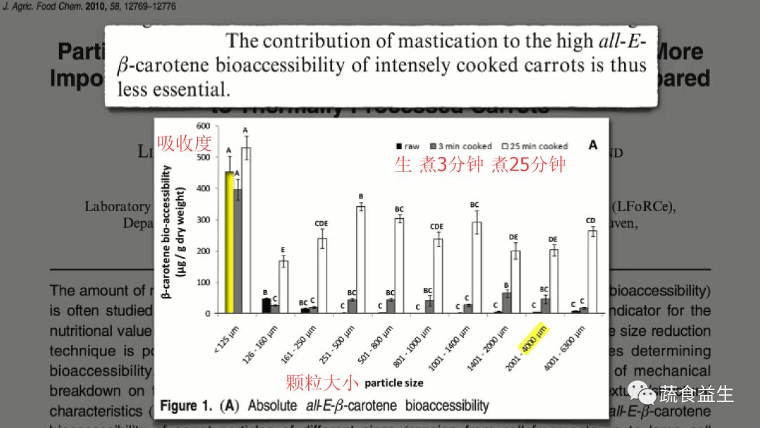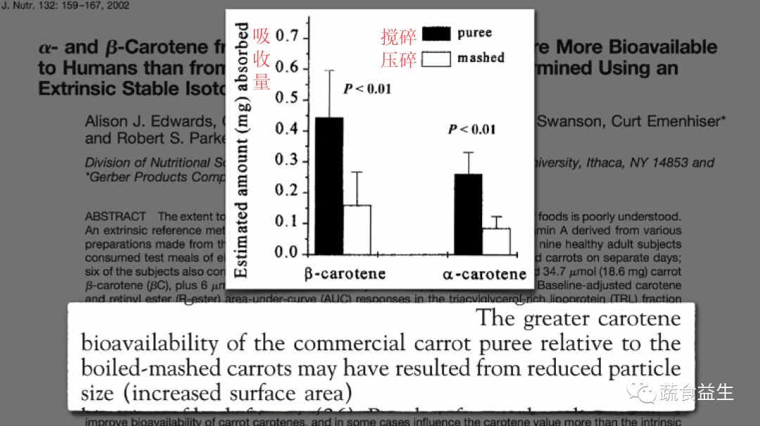 即使如此,搅拌仍可提高类胡萝卜素双倍利用率,这就可以解释搅碎再煮熟的胡萝卜比只是煮熟后压碎的胡萝卜多吸收 3 倍的α和β胡萝卜素。