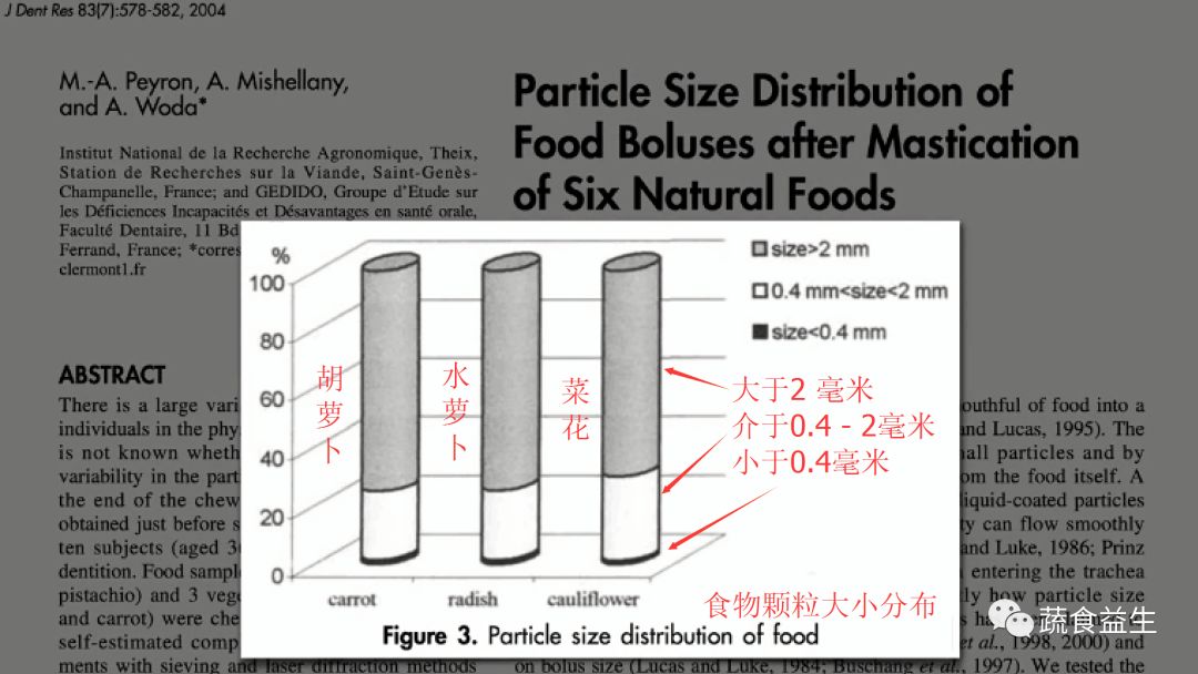 当你咀嚼时,大部分的蔬菜碎片都比 2 毫米大,就象图中所示的那样(译注:约80%),但如果我们把所有细胞壁都打开就会释放出更多营养物质。