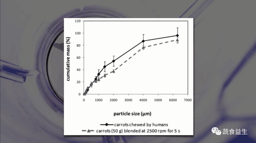 上图:人类咀嚼胡萝卜(50克)的颗粒大小与 2500 转/分搅拌机搅拌 5 秒钟的颗粒大小差不多