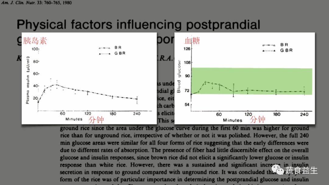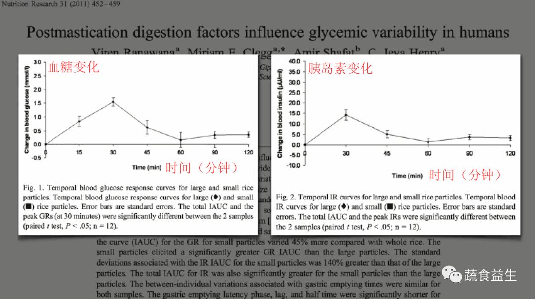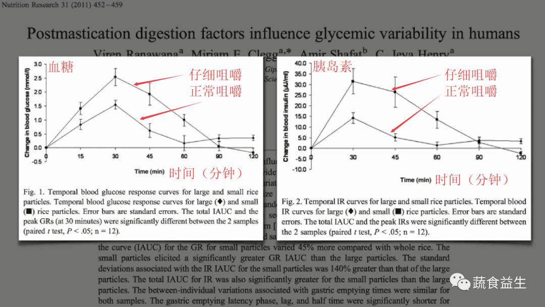 下图中较高的曲线是仔细咀嚼情况下血糖和胰岛素反应图: