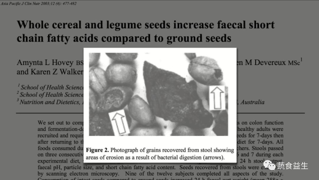 图中箭头所指显示的是粪便中谷物被细菌消化后的侵蚀部分。
