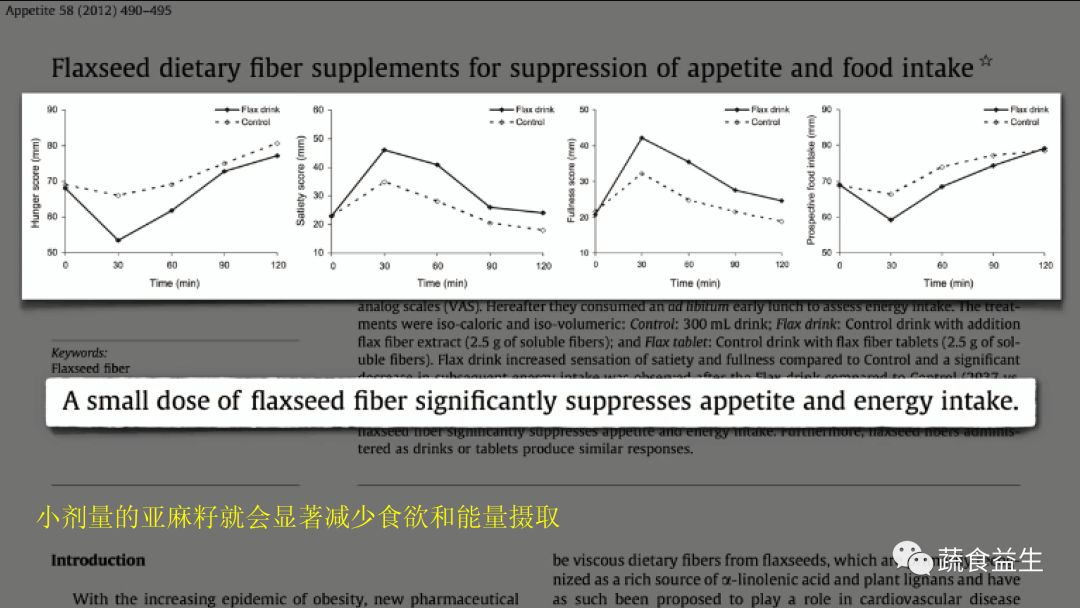 一汤匙的亚麻籽可以显著抑制食欲和热量摄取。较少的饥饿感,较多的满足感,较多的饱腹感,较少的食物摄取 –就是说如果吃了一汤匙的亚麻籽,两小时后再吃饭就会明显的少吃。
