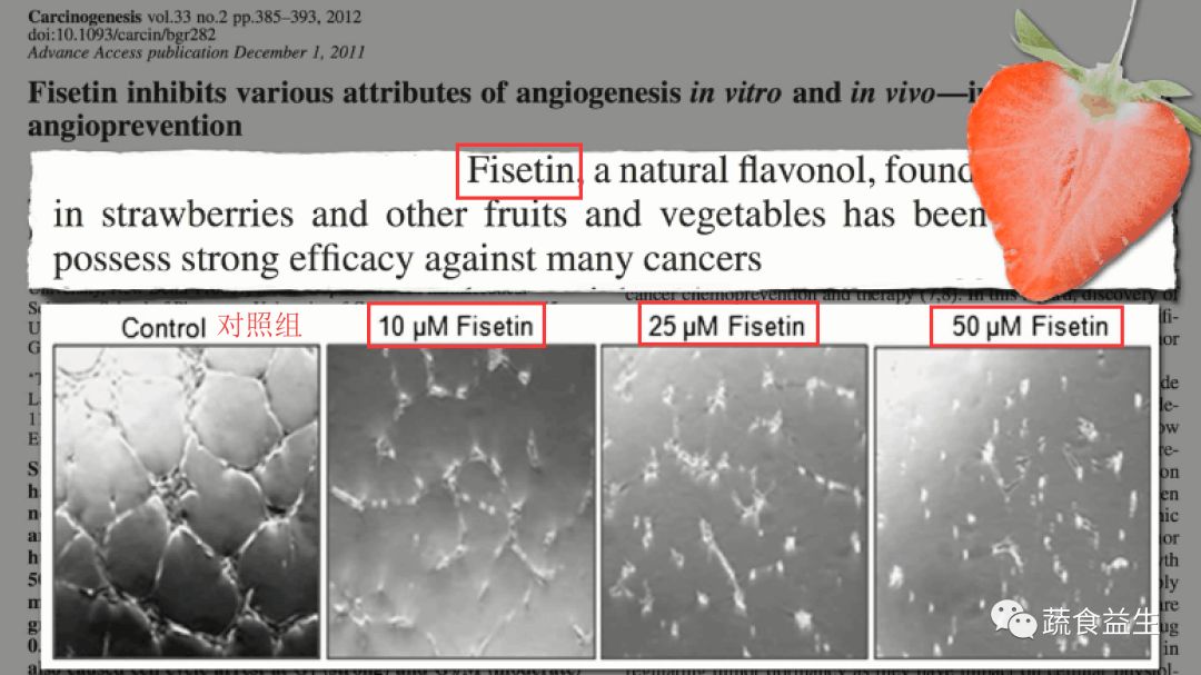 这是非瑟酮的效果,一种在草莓里发现的植物营养素,也存在于其它水果和蔬菜里。它使刚刚开始生长的新血管萎缩了。