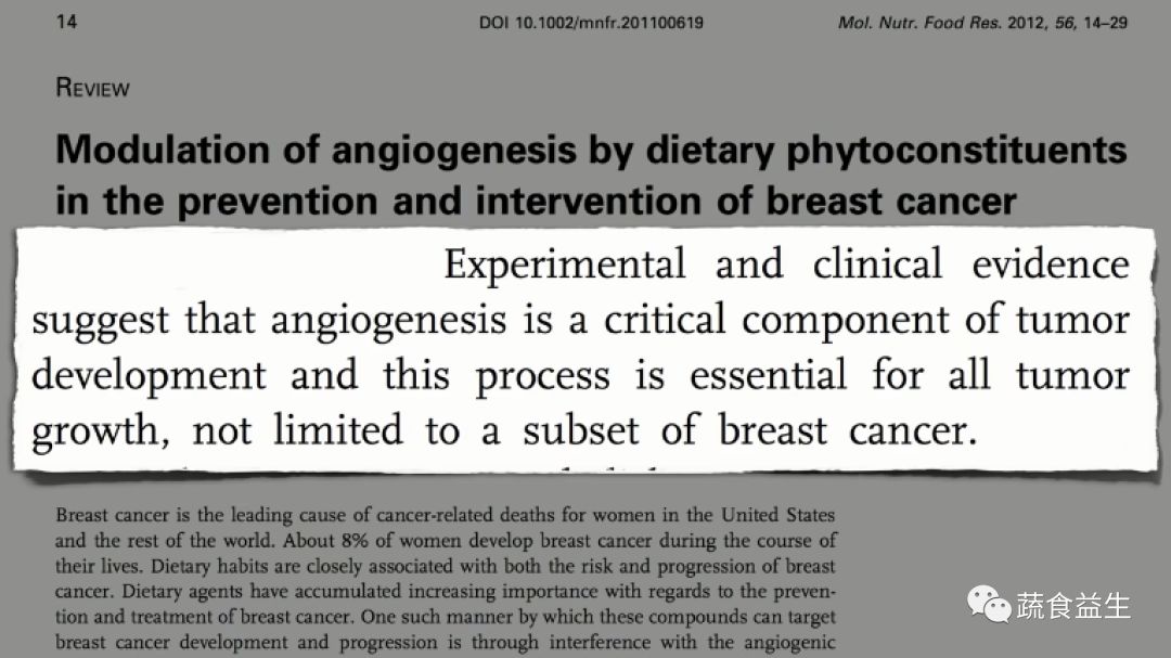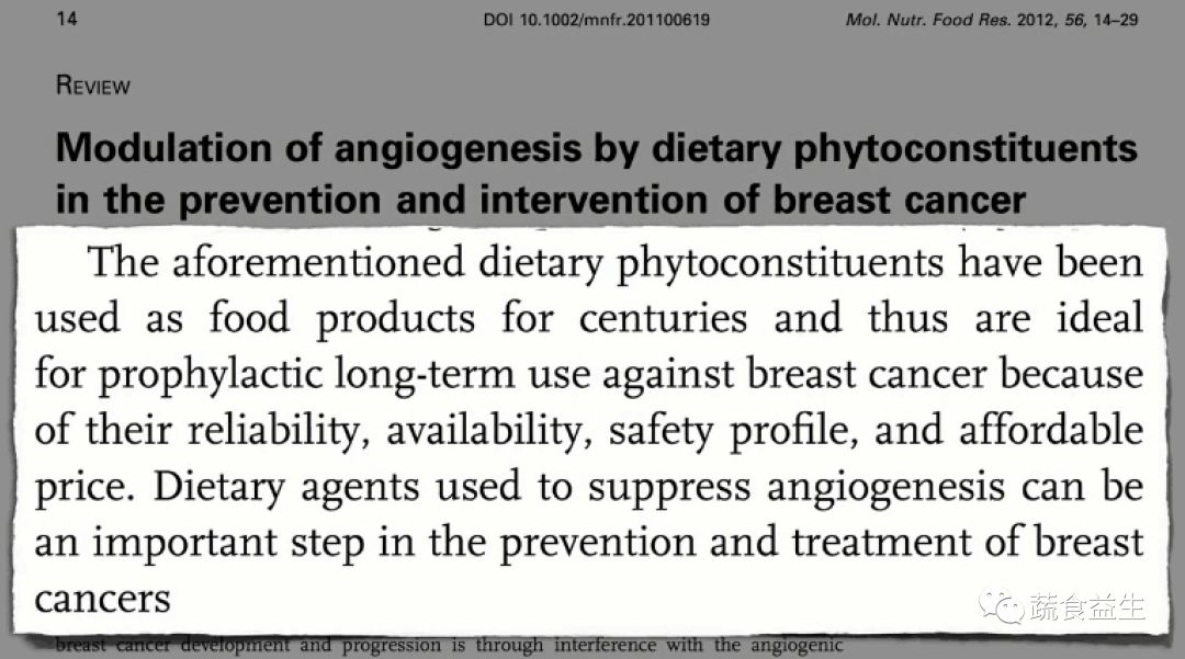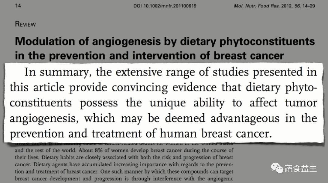 评审得出结论是我们现在有“饮食中的植物成份拥有独特的能力来影响肿瘤血管增生的令人信服的证据,这被认为有利于预防和治疗人类乳腺癌。”