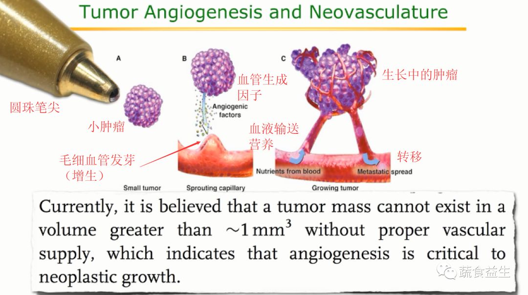目前,相信的是肿瘤在没有适当血液供给的情况下体积大于圆珠笔尖是无法存在的,这表明血管增生对于癌肿的生长是至关重要的( angiogenesis 血管增生中的angio 的意思是指血管,genesis, 指创造者)。