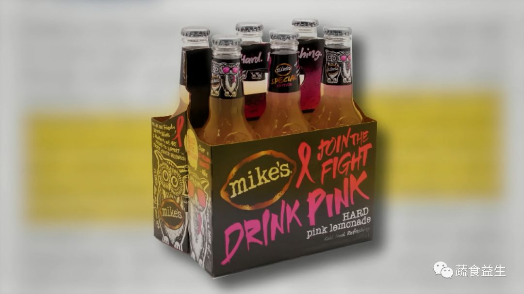 举个例子:Mike'sHard公司推出的粉色柠檬酒。(粉丝带是全球乳腺癌防治活动的公认标识)