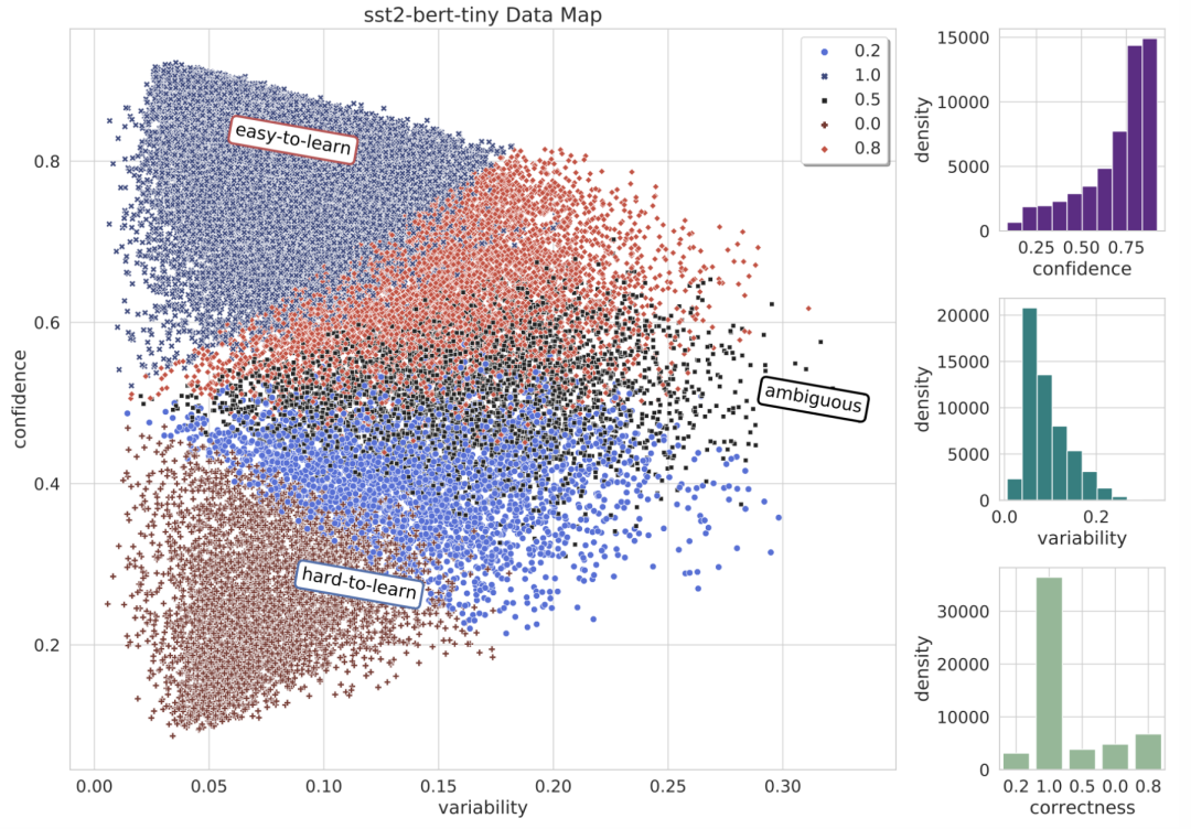 假设我们训练一个分类模型N个epoch,针对每一个sample,在每个epoch结束后,我们都记录该sample在正确类别上的概率。然后在训练结束后,我们对这N个概率,我们计算概率的均值和标准差,分别记为confidence和variability,构成该sample的坐标,这样就可以绘制数据地图(dataset cartography)。
