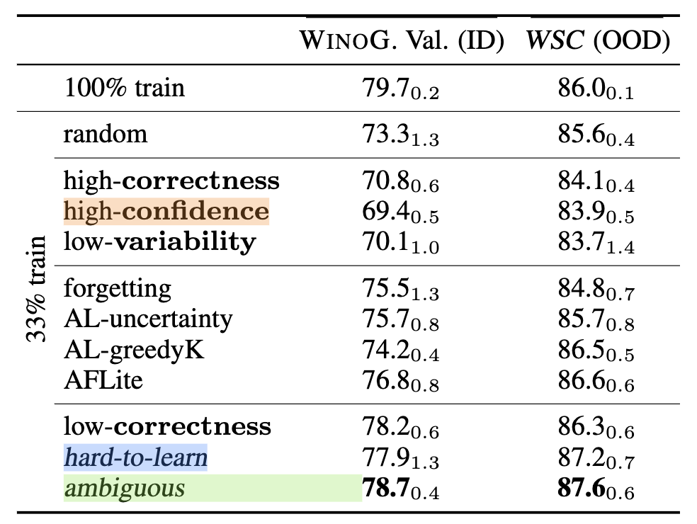 上面这个表中,作者只选取了1/3的样本,来跟全量样本的训练进行对比。high-confidence就是指easy-to-learn的样本。可以看出: