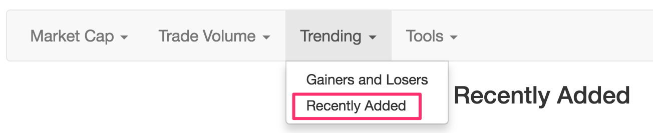 具体查询路径如下:点击网站首页的 Trending 中的 Recently Added,最近一个月新诞生的币种就全部展现出来了,如下图: