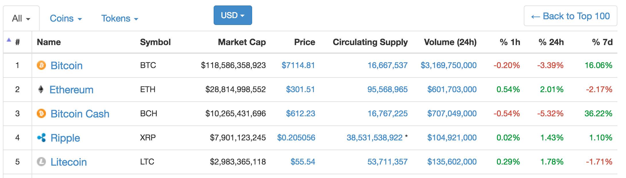 在上图中,可以看到全球目前共有 1256 个币种,其中,排名前五的币种分别为 BTC、ETH、BCH、XRP、LTC(注:准确数据以网站实时为准)。