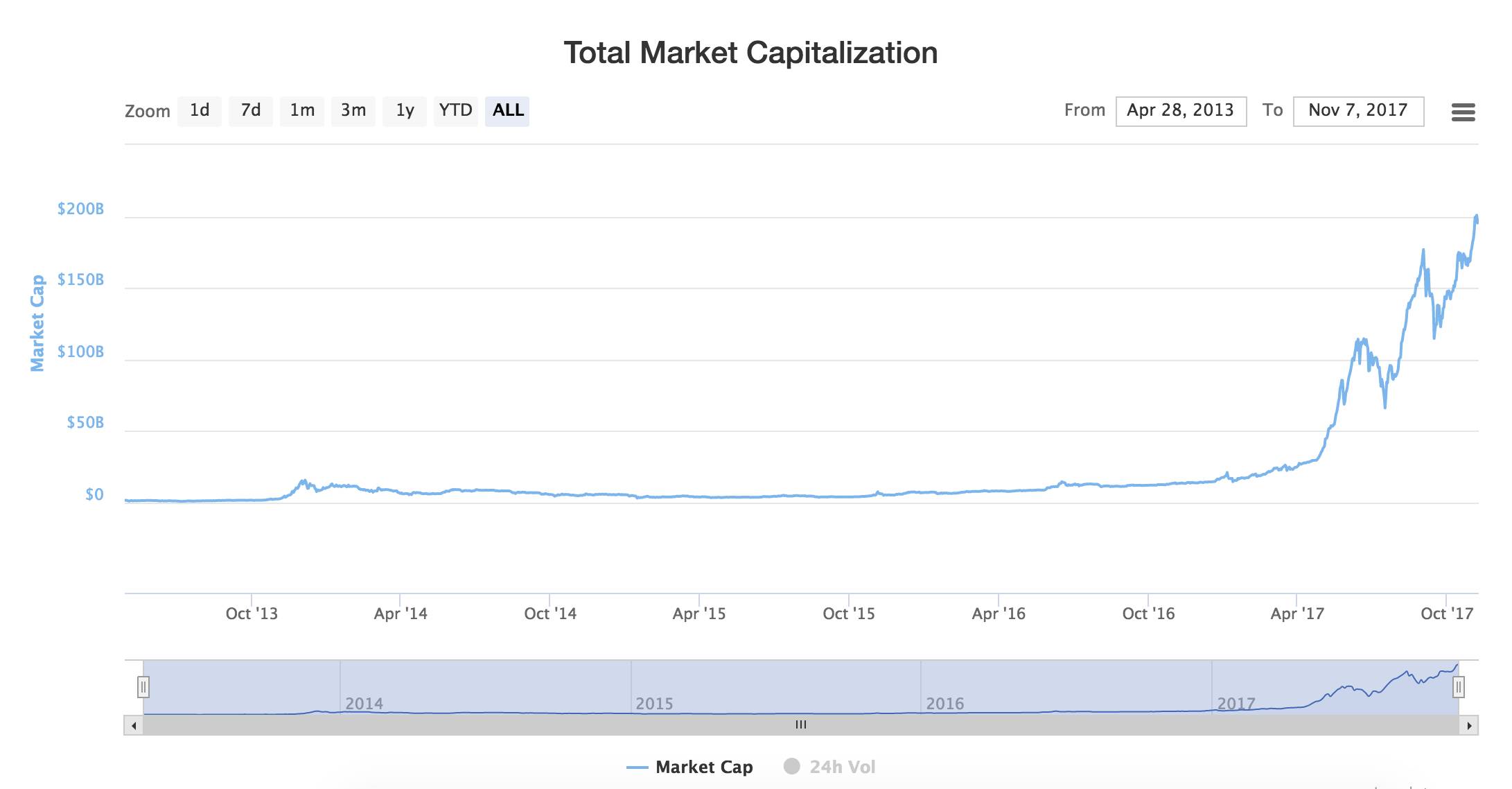 如果你想从宏观角度了解、观察整个区块链,那你要知道整个数字货币总市值的变化情况。