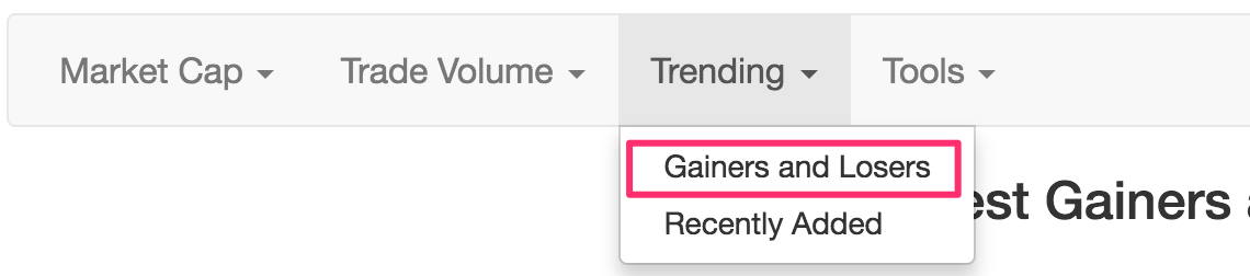 点击网站首页的 Trending 中的 Biggest Gainers and Losers,币种的涨跌排行榜就出现了,如下图: