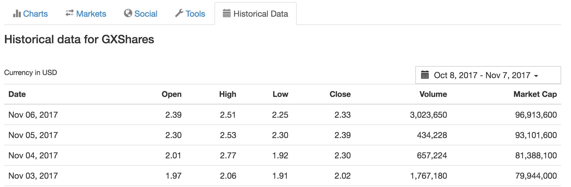 在区域 2,点击 Historical data,可以看到公信宝每天的交易情况。