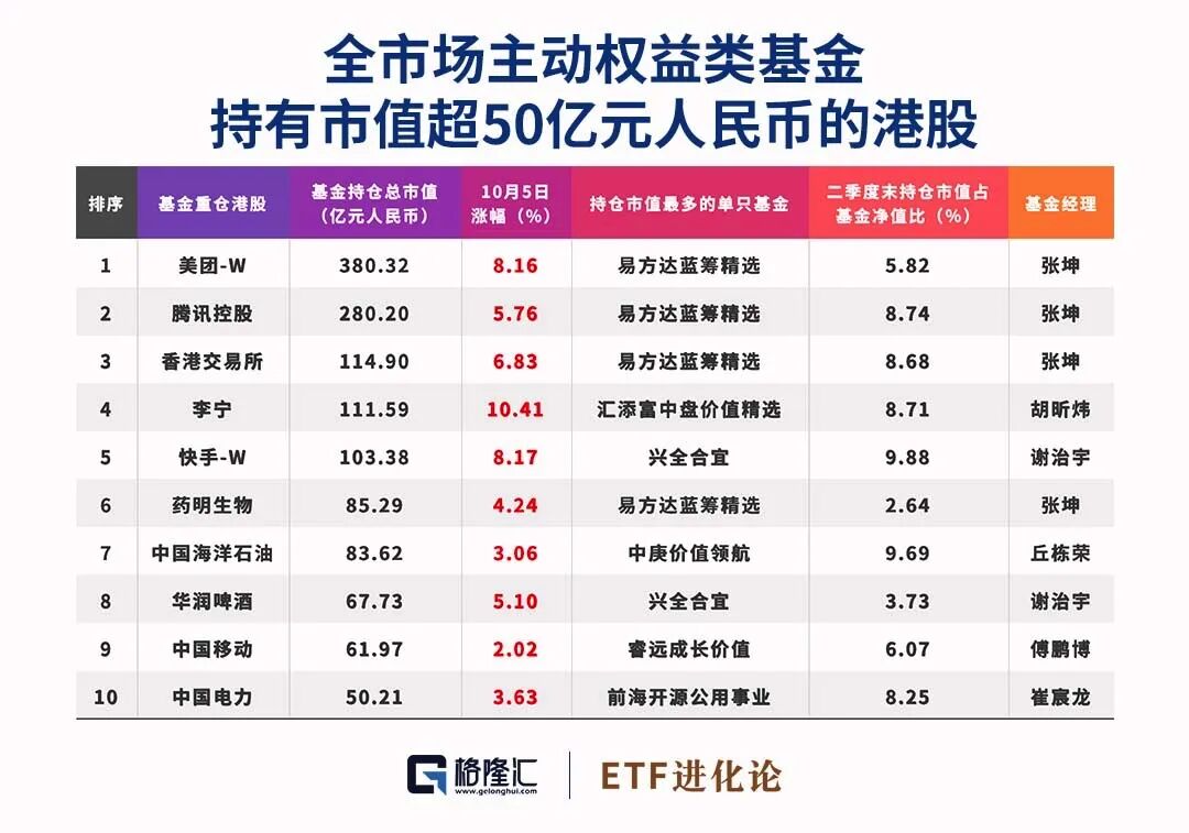 全市场主动权益类基金持有市值超50亿元人民币的港股共10只。美团-W