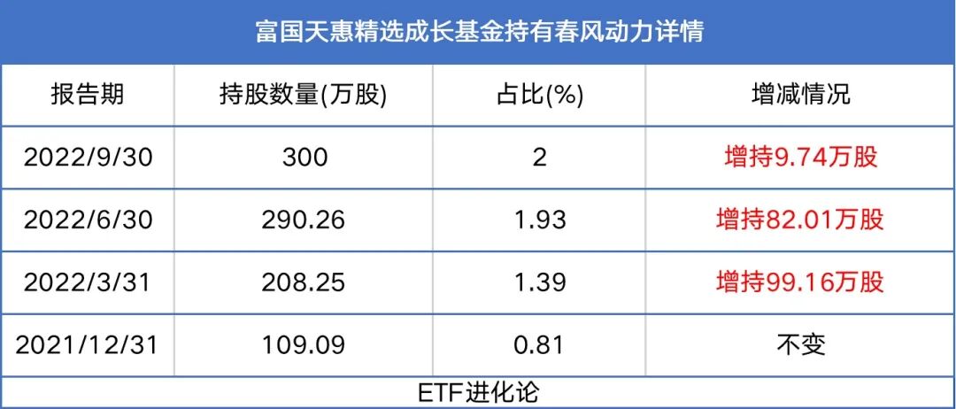 在三季度,朱少醒小幅加仓春风动力。富国天惠基金同样是在2021年四季度新进成为春风动力十大股东,持有109.09万股。随后每季度都加仓,截止三季度末最新持股300万股,按149.87元每股股价算,持股市值4.5亿。
