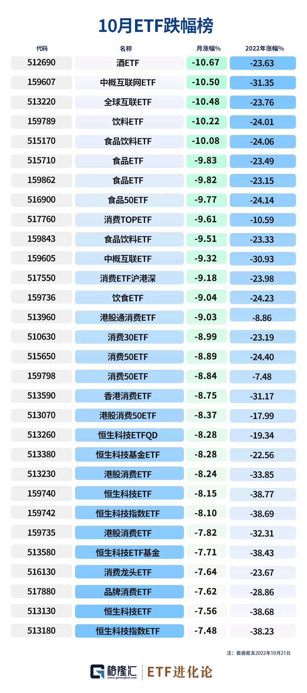 10月以来贵州茅台股价跌幅达13.27%,ETF跌幅榜中,酒ETF跌超10%。在10月ETF跌幅榜中,上榜最多的集中在消费、中概互联网和恒生科技板块上。
