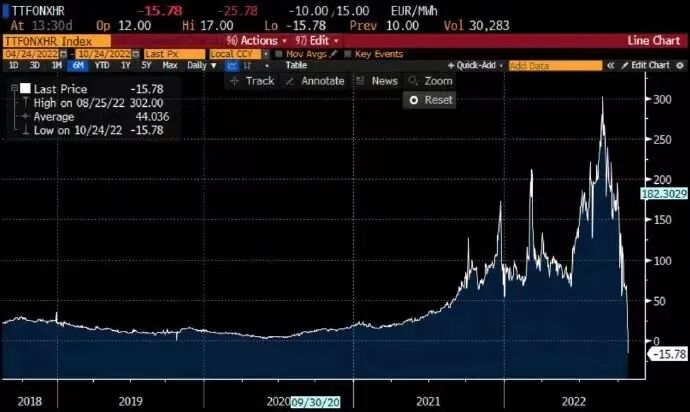 美国天然气价格大跌50%后,10月24日欧洲部分天然气现货价格跌至-15.78欧元每兆瓦时,创历史最低价格。
