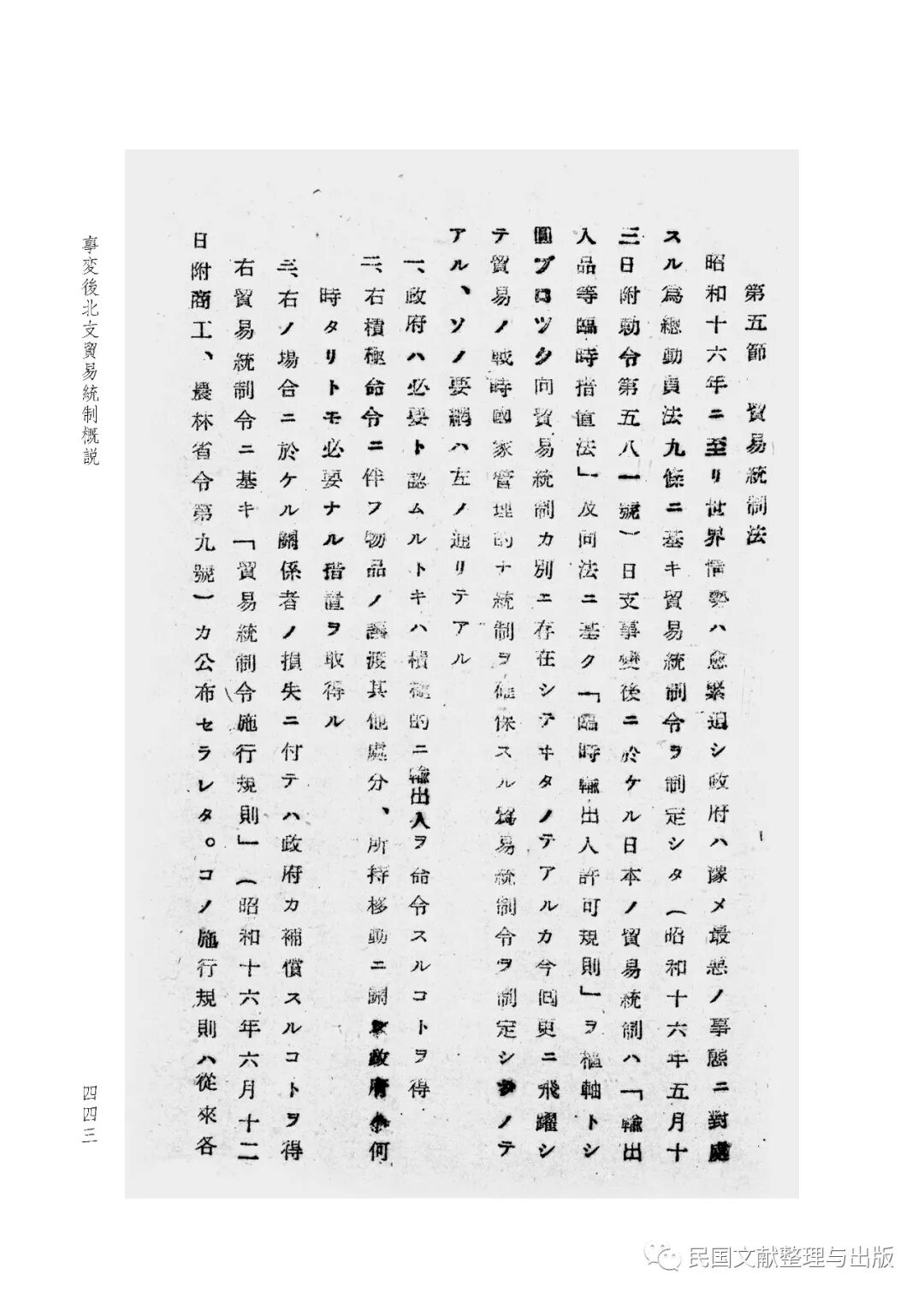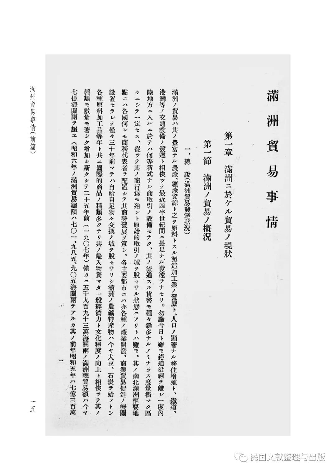 《近代日本对华调查档案资料丛刊》计划将近代日本对华调查的文献资料系统整理,分辑影印出版。第六辑主要收录商业、贸易调查资料二百余种,成书八十册。调查机构包括南满洲铁道株式会社下设诸调查部门、伪满洲国经济部商务司、伪满洲中央银行调查部、伪兴农合作社中央会等。根据文献内容,主要分为以下四类:(一)商业调查,包括对商业概况、商业组织、交易市场、地区商业实态的调查;(二)物价调查,包括物价统制情况,各地区农副、工矿等各类产品的月间、年度价格比较以及批发、零售物价统计等;(三)贸易调查,包括国内外贸易概况、各类商品的市场行情、进出口贸易统计等;(四)关税调查,包括海关制度、关税税率统计等。