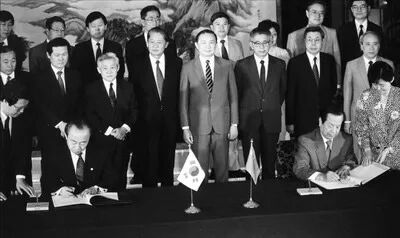 ◆1992年8月24日,中国国务委员兼外交部部长钱其琛同韩国外务部长官李相玉在北京签署中韩建交联合公报。