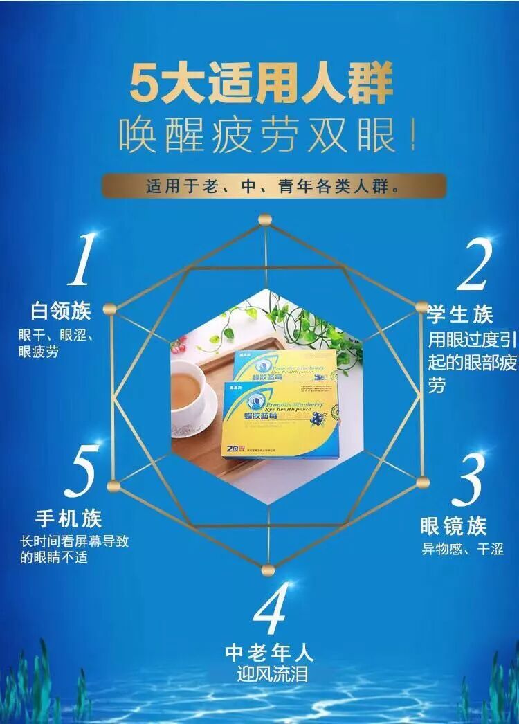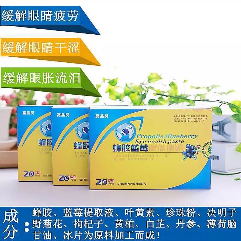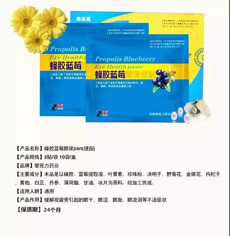 除了含蓝莓提起液外,眼贴还含有蜂胶、珍珠粉、决明子、枸杞子、黄柏、丹参等14味植物中草药,穴位给药,清热明目,活血化瘀。