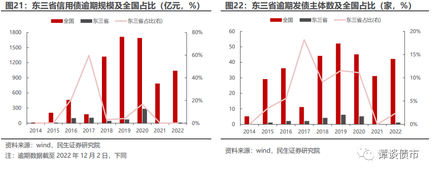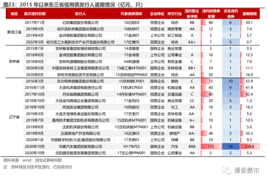 究其原因,东三省城投逐步被市场边缘化与此前些年份区域内频发的信用事件有直接关系。2017年丹东临港(辽宁)、亿阳集团(黑龙江)两家民营企业违约,合计逾期规模全国占比达60%,区域内城投结构性发行困难愈发突出。