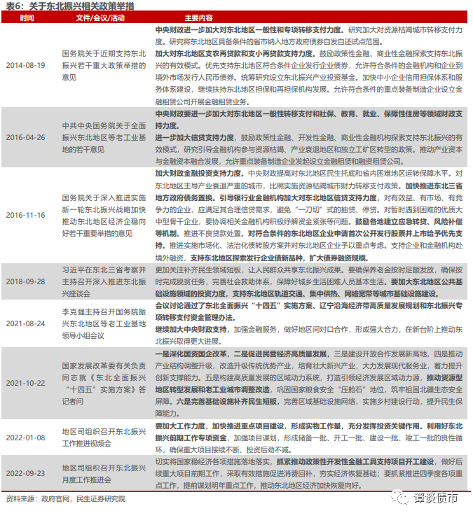 为应对市场风险进一步分层下区域净融资持续弱化,强化城投平台在债券市场的存在感,东三省政府从债务风险化解、国企改革两个方面出台了系列措施,中央层面也出台了东北振兴相关政策。