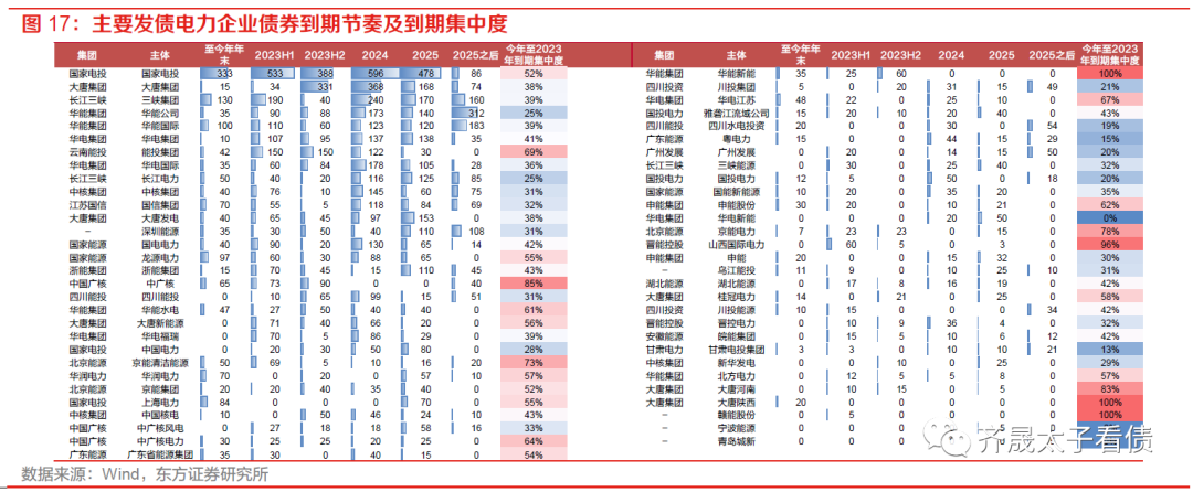 央企债券到期节奏平稳、兑付压力可控,关注个别到期规模大且集中度高的地方国企。央企中,国家电投每年到期规模显著大于其他主体,2023年前到期规模合计1254亿元,到期集中度约52%;大唐、三峡、华能债券存续规模在900亿级左右,短期看兑付集中度尚可,2024~2025年为到期相对密集时期,大唐从2023年下半年开始兑付规模变大。地方国企中,至今年年末江苏国信、京能清洁能源、云南能投、深圳能投等有一定到期规模,云南能投2023至2024上半年到期兑付压力明显增大。