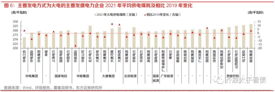 从时间维度上看,在新建高能效机组投产和高能耗机组改造升级等因素推动下,相比2019年平均供电煤耗整体下降,幅度约5克/千瓦时,个别有所上升如大唐河南、大唐陕西和江苏国信,大唐陕西以城区供热机组为主煤耗偏高。