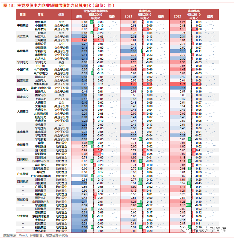 受2021年煤价上涨挤压盈利空间影响,EBITDA利息保障倍数整体滑降趋势明显。华电系、大唐系子公司及广东能源、皖能、京能、赣能等以煤电为主的电厂降幅最大,相比2019年稳中有升的多为清洁能源发电主体。从当前绝对水平看,央企EBITDA利息保障倍数偏低的有大唐和华润,仅有1.6倍左右,其余基本在3倍上下,三峡集团最高5.84倍;地方国企同样以2~4倍居多,2倍以下有7家,主力机组多为煤电。