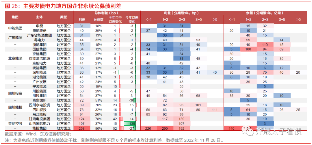 具体来看当前各电力发债主体不同期限利差、存续余额及整体利差历史分位数表现。电力发债主体目前主流融资品种是非永续公募债,非永续私募债发行量很低且近年来进一步萎缩,另外永续债发行规模也较大,因此我们主要计算研究非永续公募债利差和永续债利差。
