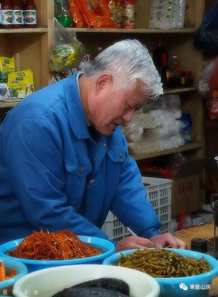 店里的柜台上摆着几个盆,里面放着酱黄瓜、榨菜、酱疙瘩、辣菜丝等等。