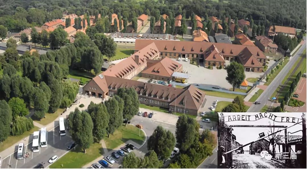 奥斯维辛纪念馆鸟瞰。正中那个大院以前是集中营的管理处和兵营、家属区等等。现在是纪念馆管理、接待机构以及相关的各种设施。后边树丛之间那一排排房屋就是当年的囚室,现在部分辟为陈列厅。画面左边的树丛中有当年的毒气室和焚尸炉。右下图是当时集中营大门。现在仍保留原样,就在大图左边树丛浓阴下那个地方