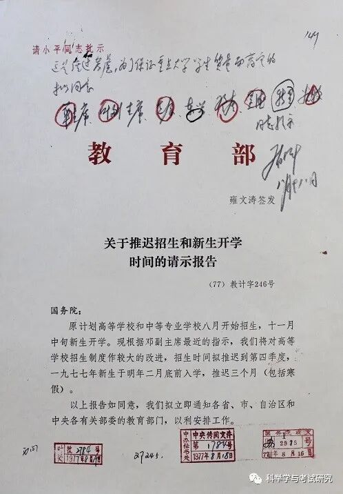 邓小平关于推迟1977年招生和新生开学时间的批示(1977年8月)