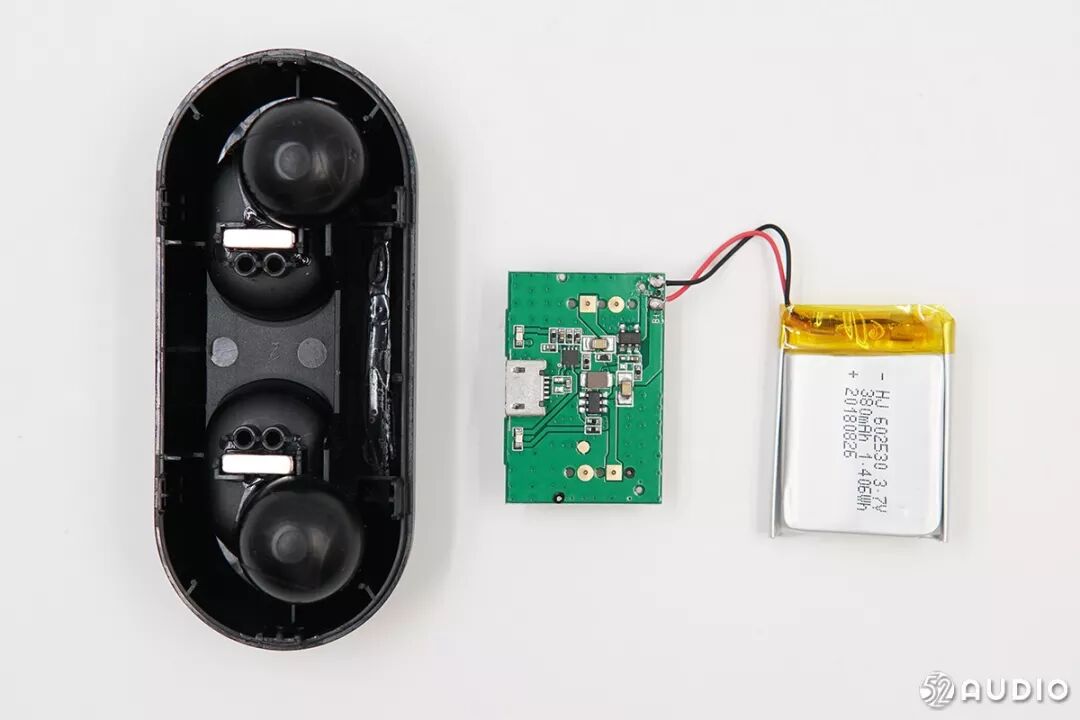 耳机充电盒内部特写,由一块主板和一块电池组成。