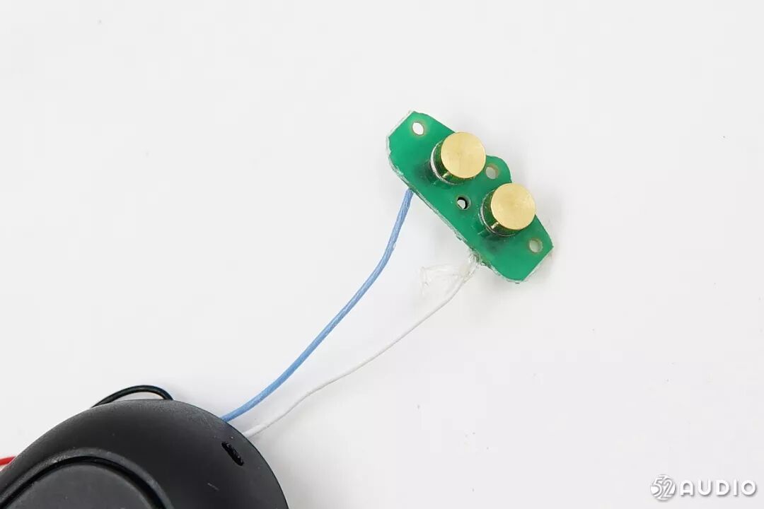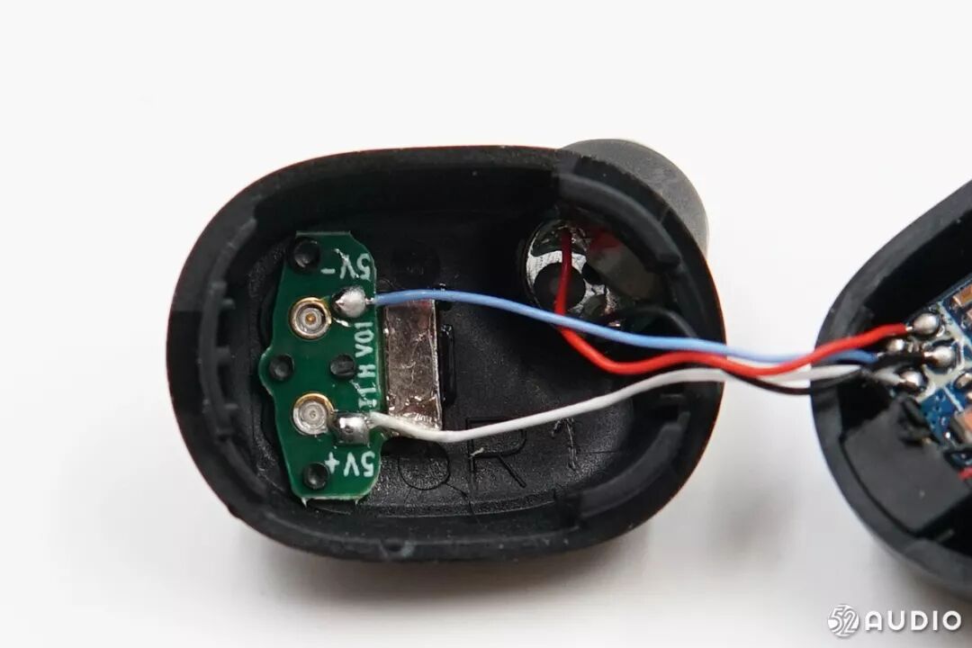电池连接到主板上,使用充电触点给耳机充电。