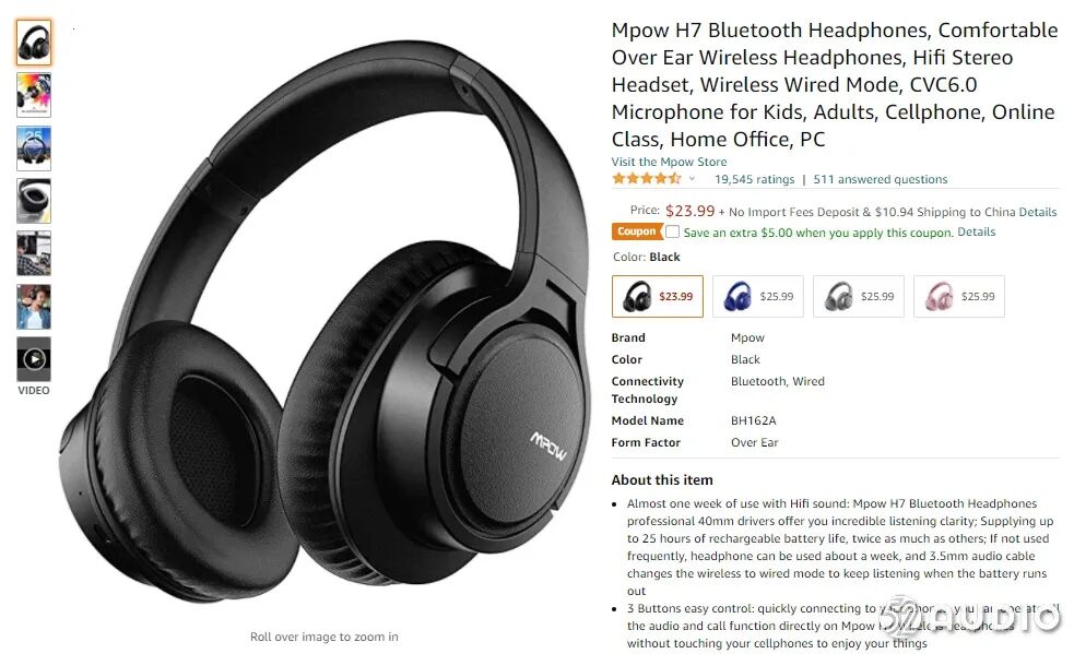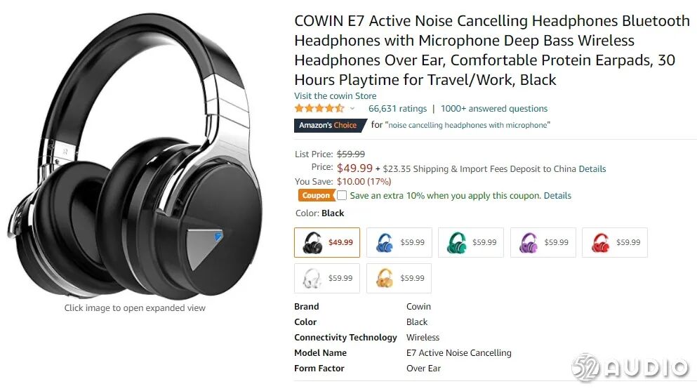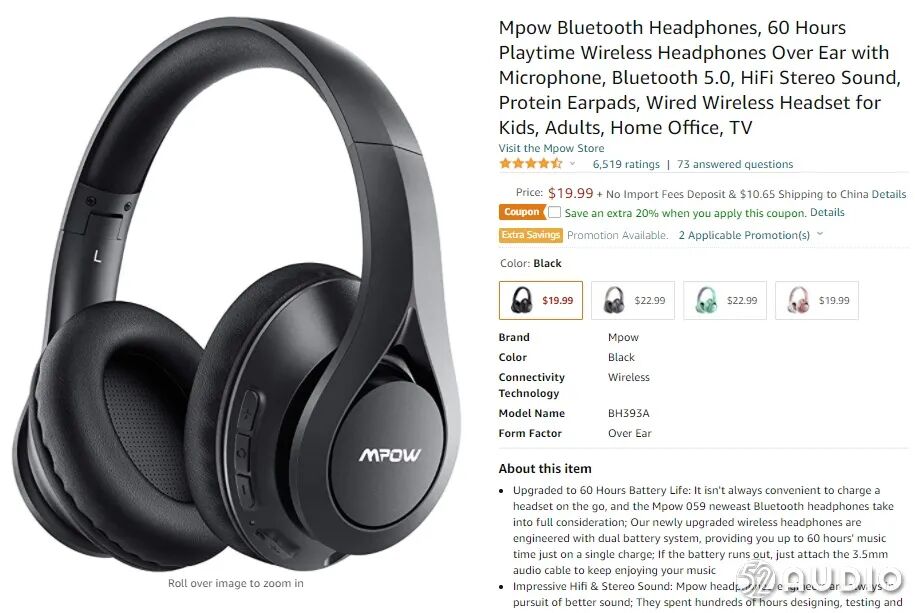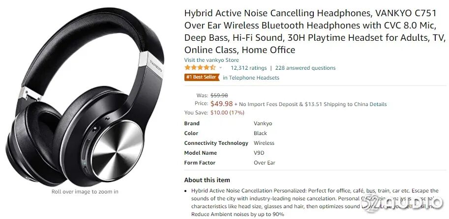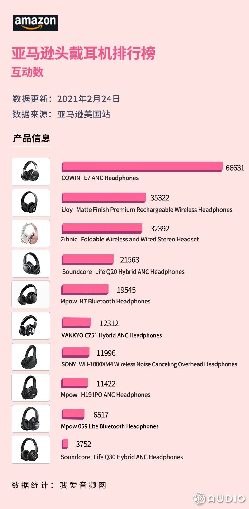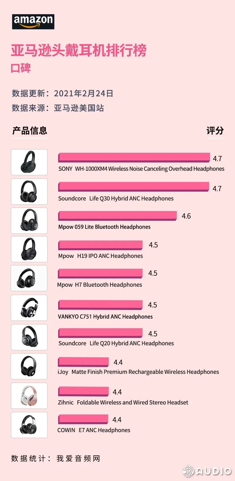 Amazon亚马逊官方有一个“Best Sellers”榜单,每小时更新,头戴式蓝牙耳机被归类为“Over-Ear Headphones”。我爱音频网按照销量顺序从中找出了10款头戴式蓝牙耳机,统计日期是2021年2月24日,产品价格、评分、评论数均以当时的数据为准。