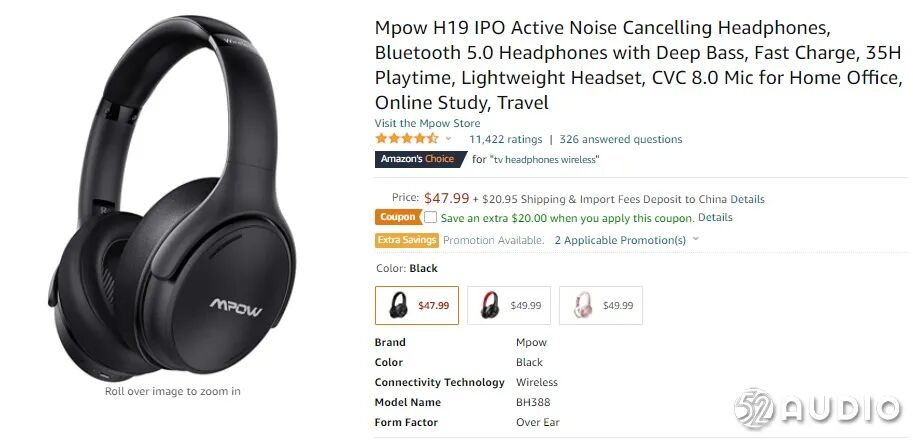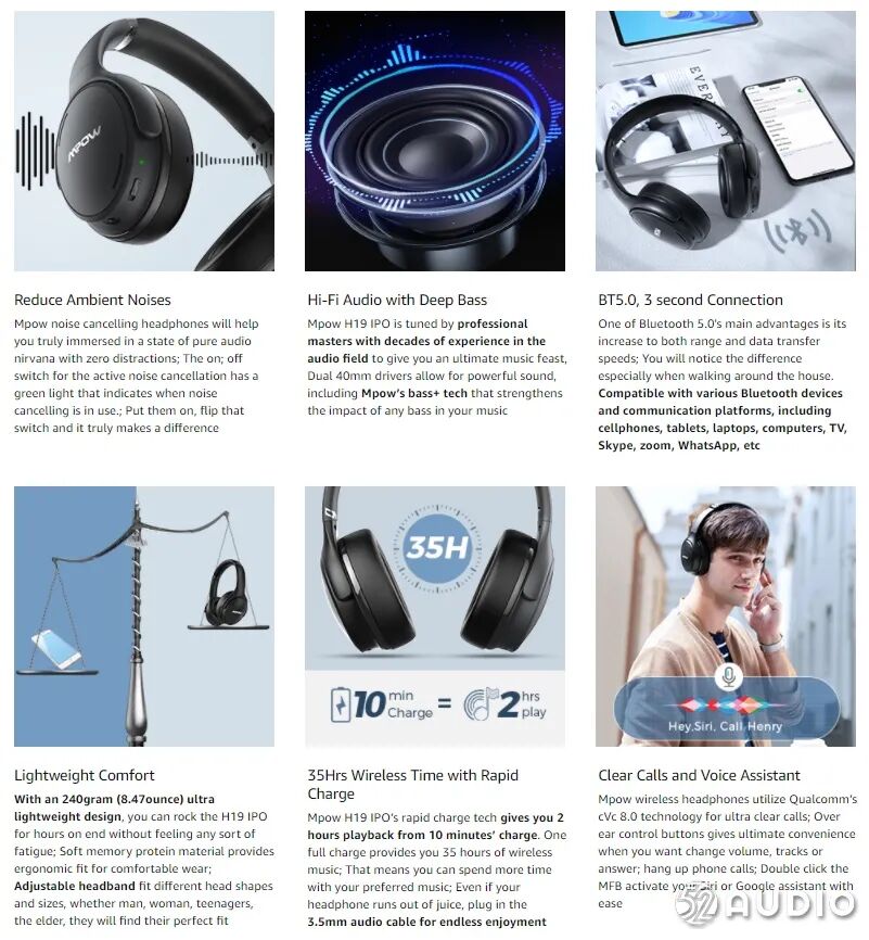 Mpow H19 IPO支持ANC主动降噪,主控芯片来自高通,支持蓝牙5.0,支持高通cVc 8.0通话降噪算法;耳机内置40mm驱动单元,支持Mpow的bass+低频增强技术;耳机充满电的续航时间约35小时,支持快充,充电10分钟音乐续航2小时;有3.5mm音频接口,电池没电可以当作有线耳机继续使用。