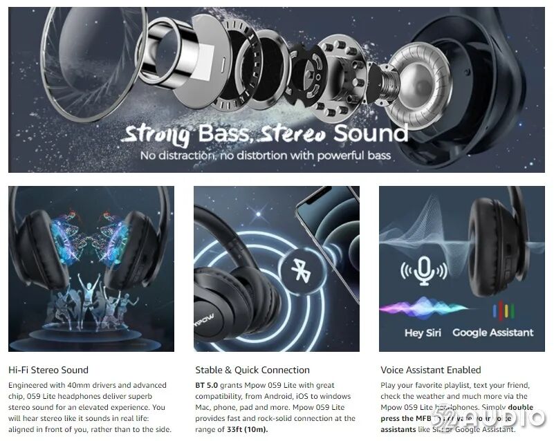 Mpow 059 Lite内置40mm驱动单元,主控芯片支持蓝牙5.0,支持CVC6.0通话降噪功能;耳机有3.5mm音频接口,电池耗尽时可以当作有线耳机继续使用。