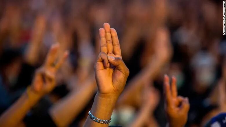 这次,年轻人的抗议者又不约而同地举起三根手指,沉默地宣告着对政府和王室的愤怒。