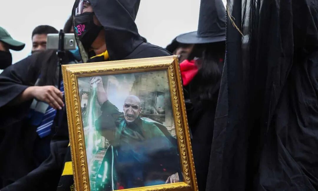 身披黑色魔法师斗篷,举着伏地魔图片的泰国年轻人走上街头。