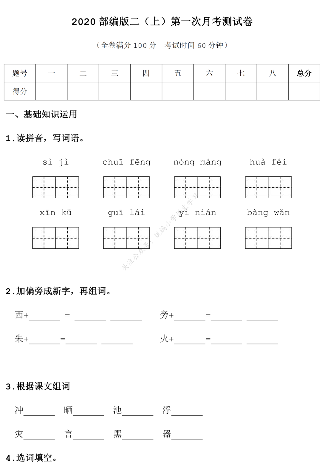 九月即将结束,小语老师今天给大家整理部编版二年级语文上册第一次月考试卷(考查范围:1-2单元),总共有2套,请各位家长打印给孩子练练,更好的巩固第一二单元的知识点!