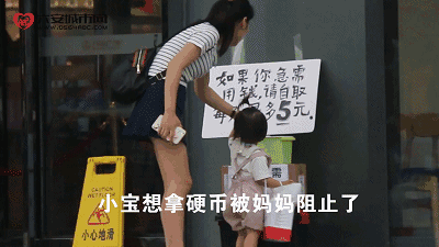 小朋友好奇地想去拿钱,却被年轻的妈妈阻拦,这些钱应该留给更需要它们的人……