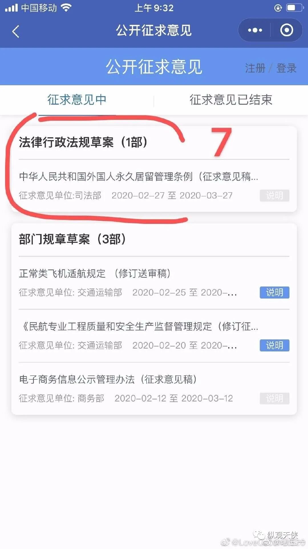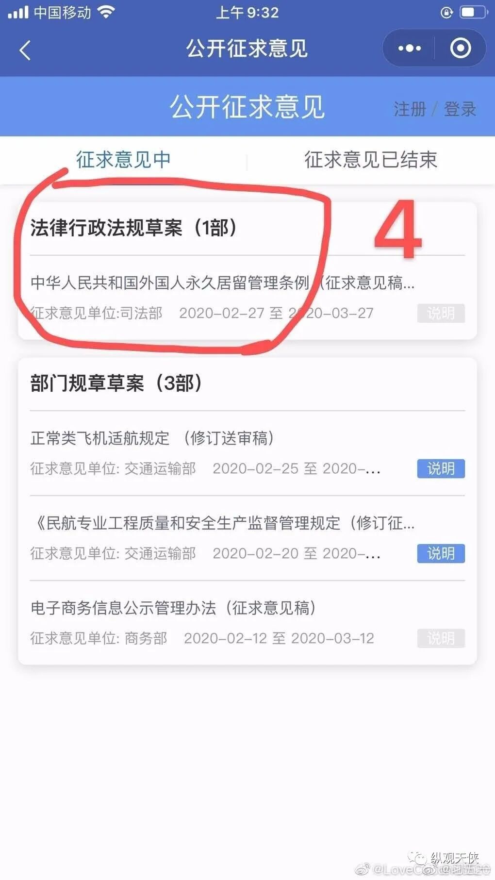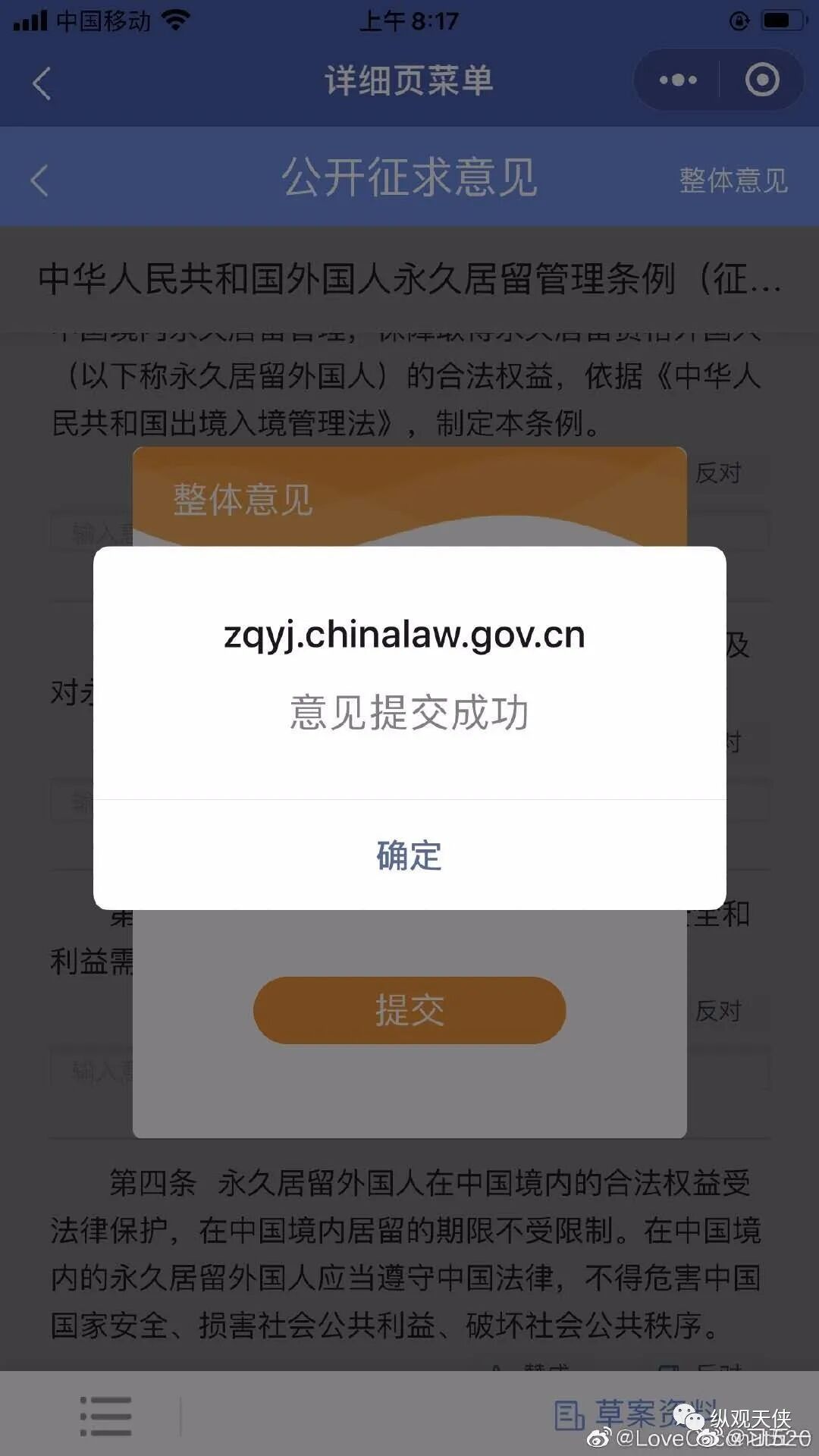 [cp]#外国人永久居留管理条例#【司法部的网站难以登陆,推荐使用微信“中国法律服务网”。】政府修订条例,征求大众意见。民意是政府决策的社会基础。请大家行动起来!小程序有些繁琐,有的时候反应迟缓。请大家一定要坚持不懈,跟着步骤做!