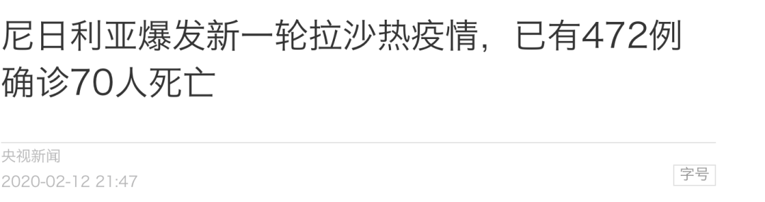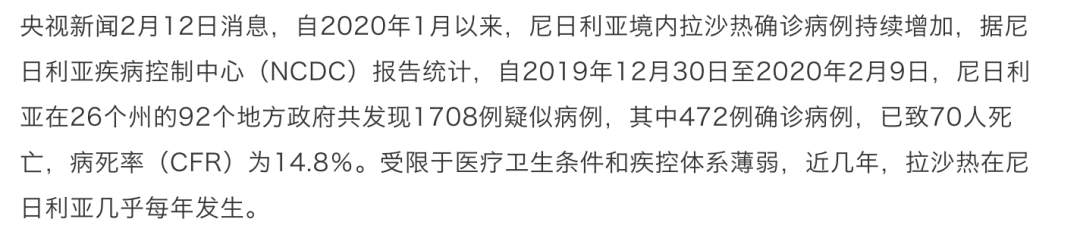 尼日利亚从19年12月30日到2月9日,爆发新一轮拉沙热疫情攻,472例确诊,1708例疑似病例,死亡人数70人,死亡率14.8%!
