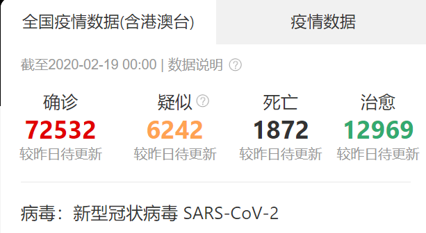 截至2月19日凌晨,已经造成了中国境内72532人感染,1872人死亡以及海外多达二十多国出现确诊病例。