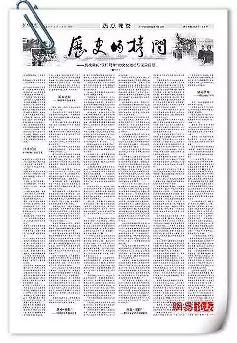 《解放军报》曾刊发整版文章,剖析抗战期间的“汉奸现象”,而国防部网站在转发时还配发大量中外历史照片。文章追溯了“汉奸”的起源和定义。文章指出,中国是唯一一个在第二次世界大战中伪军数量超过侵略军队数量的国家,这确实是一个极其可悲的历史现象。文章说,西方国家搞“颜色革命”和“政治转基因”工程愈演愈烈,一些政治上的意志薄弱者和利欲熏心的贪婪之徒,已经或正在成为敌对势力捕猎的对象。今天的中国应该铲除滋生汉奸的土壤。